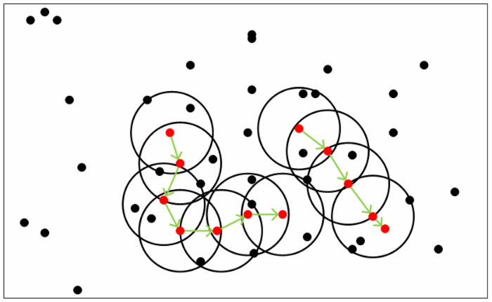 如图:当设置 MINPTS = 5 时,红色点在一定范围内都有5个或以上的邻居,那么是核心点,在这些红点的范围内的邻居则是边界点,其它的则是燥音点。
